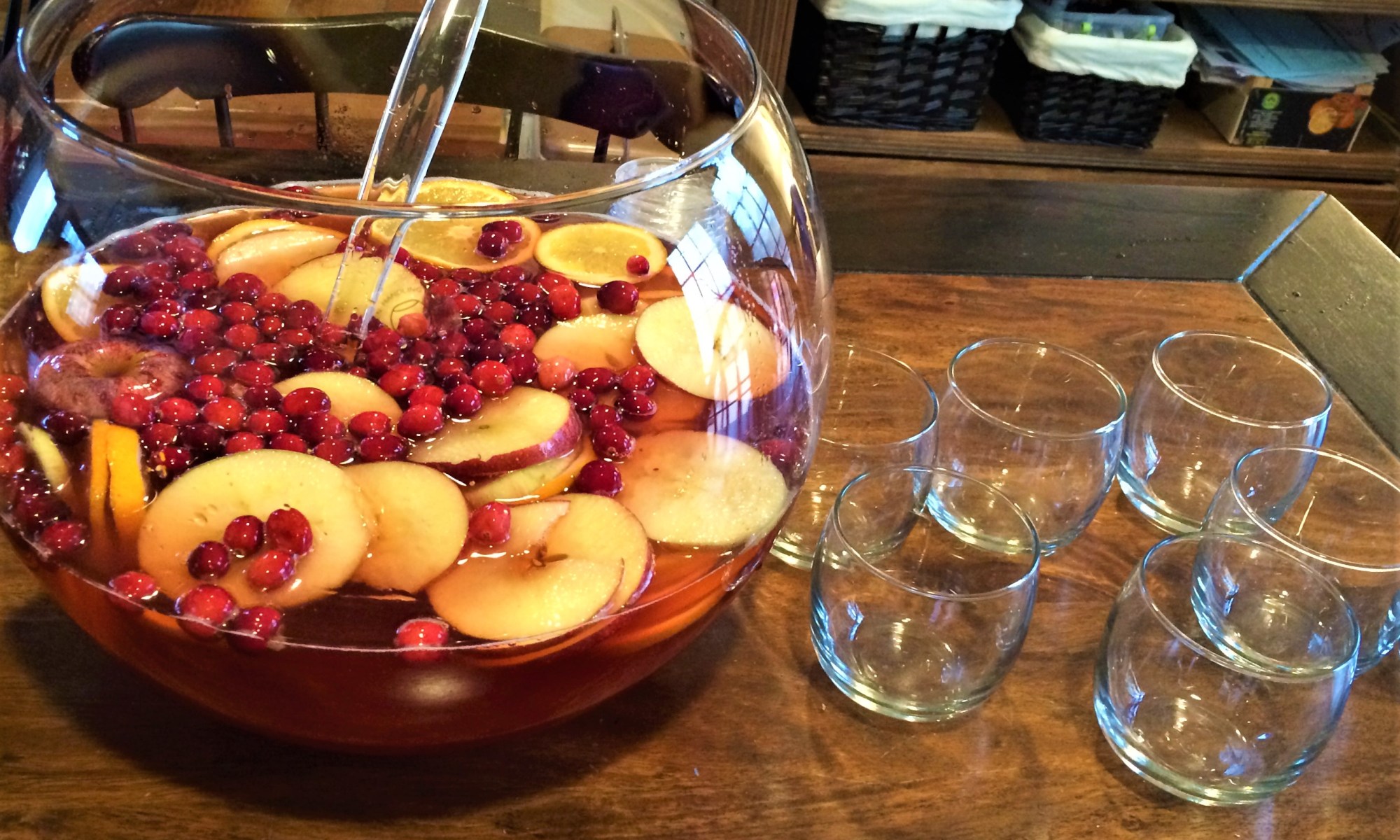 3. Thinly slice the apples and oranges and layer into a punch bowl. Â Add cranberry juice, apple juice, and whiskey and stir gently to combine.